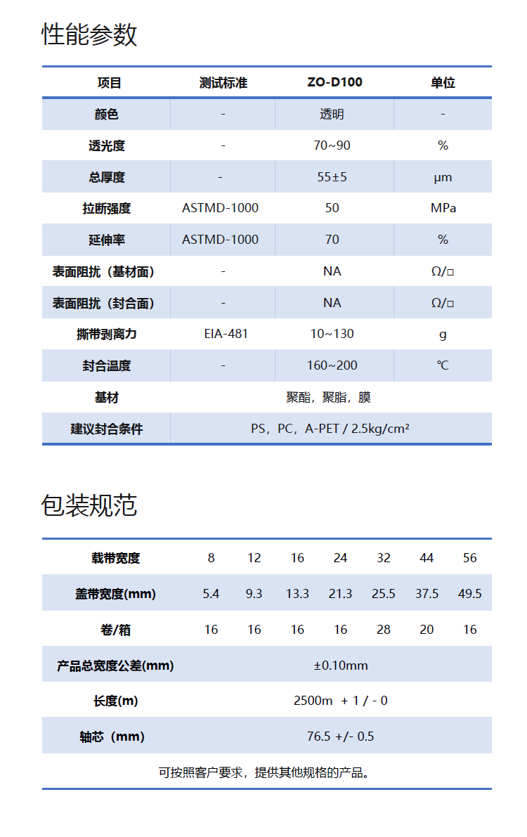 ZO-D100蓋帶是指在一種應(yīng)用于電子包裝領(lǐng)域的帶狀產(chǎn)品,與載帶配合使用,可在外力或加熱的情況下封合在載帶的表面,形成閉合的空間,保護載帶口袋中電子元器件。